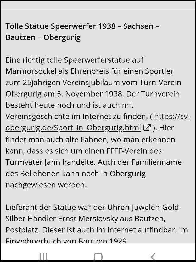 Mit diesem Titel wurde im Juni 2022 eine Sperrwerferstatue auf Marmorsockel des „Turnverein Obergurig e.V.“ als Ehrenpreis für einen Sportler zum 25 Jährigen Vereinsjubiläum angeboten.