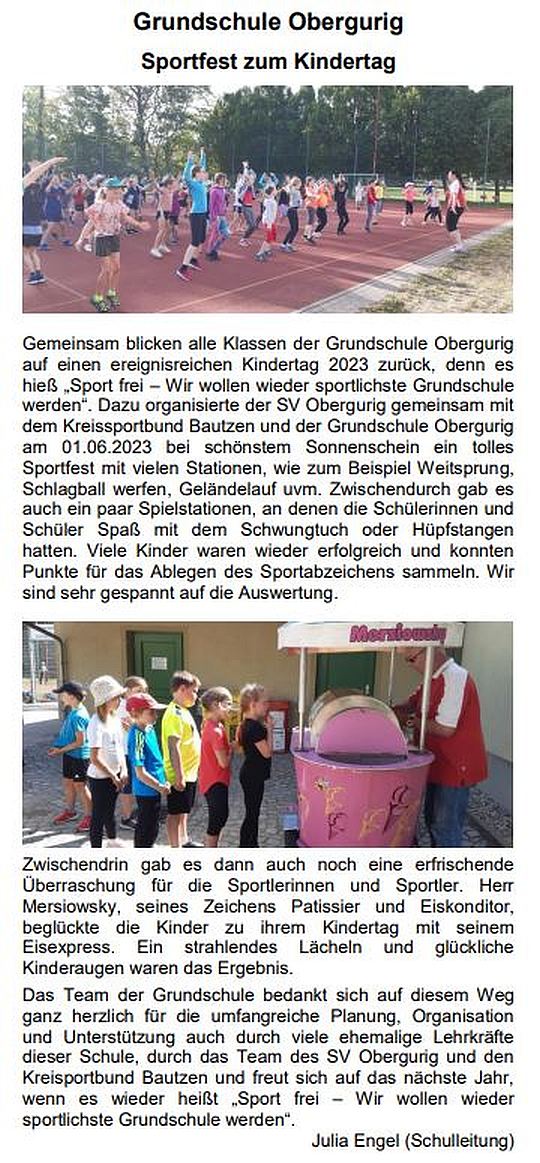Die Oberguriger Grundschule wurde 2021 aufgrund eines Aufrufs der Deutschen Sportjugend und der damit folgenden Initiative des Sportvereins Obergurig sportlichste Schule im Landkreis Bautzen. Fast 100 der etwa 140 teilnehmenden Kinder legten damals an dem Aktionstag das Deutsche Sportabzeichen ab.