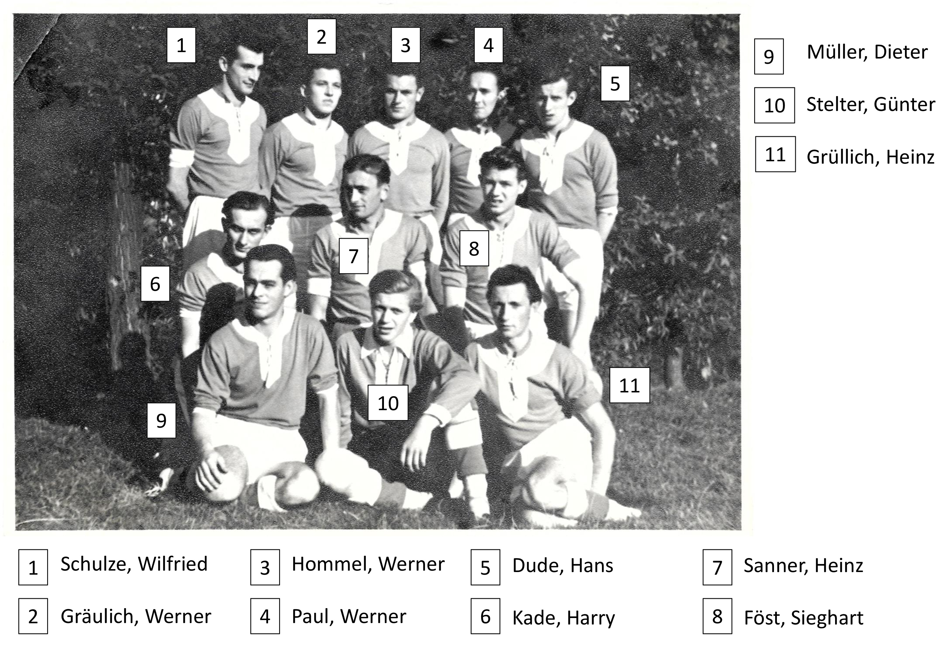 Kürzlich hat uns Frank Föst aus Obergurig ein altes Foto aus seinem Familienfundus übergeben. Auf diesem ist sein Vater zu sehen, der 1953 bei der gerade in die "BSG Motor Obergurig" umbenannten Handballmannschaft spielte. Mehr war in diesem Moment nicht bekannt. In einem Aufruf in der Januarausgabe 2024 des Oberguriger Mitteilungsblatts baten wir die Oberguriger Leser uns mehr zu diesem Bild zu sagen. Zahlreiche Oberguriger konnten die Namen der auf diesem Bild zu sehenen Spieler zuordnen, die auch unabhängig voneinander bestätigt wurden. In unserem Vereinsarchiv gibt es noch weitere historische Fotos aus dieser Zeit. So können wir auch künftig noch die Protagonisten zuordnen. Vielen Dank an alle, die hier mitgewirkt haben. Den meisten dürfte die inzwischen etwas verblassenden Handballtradition wieder in Erinnerung gerufen worden sein.(jt)
