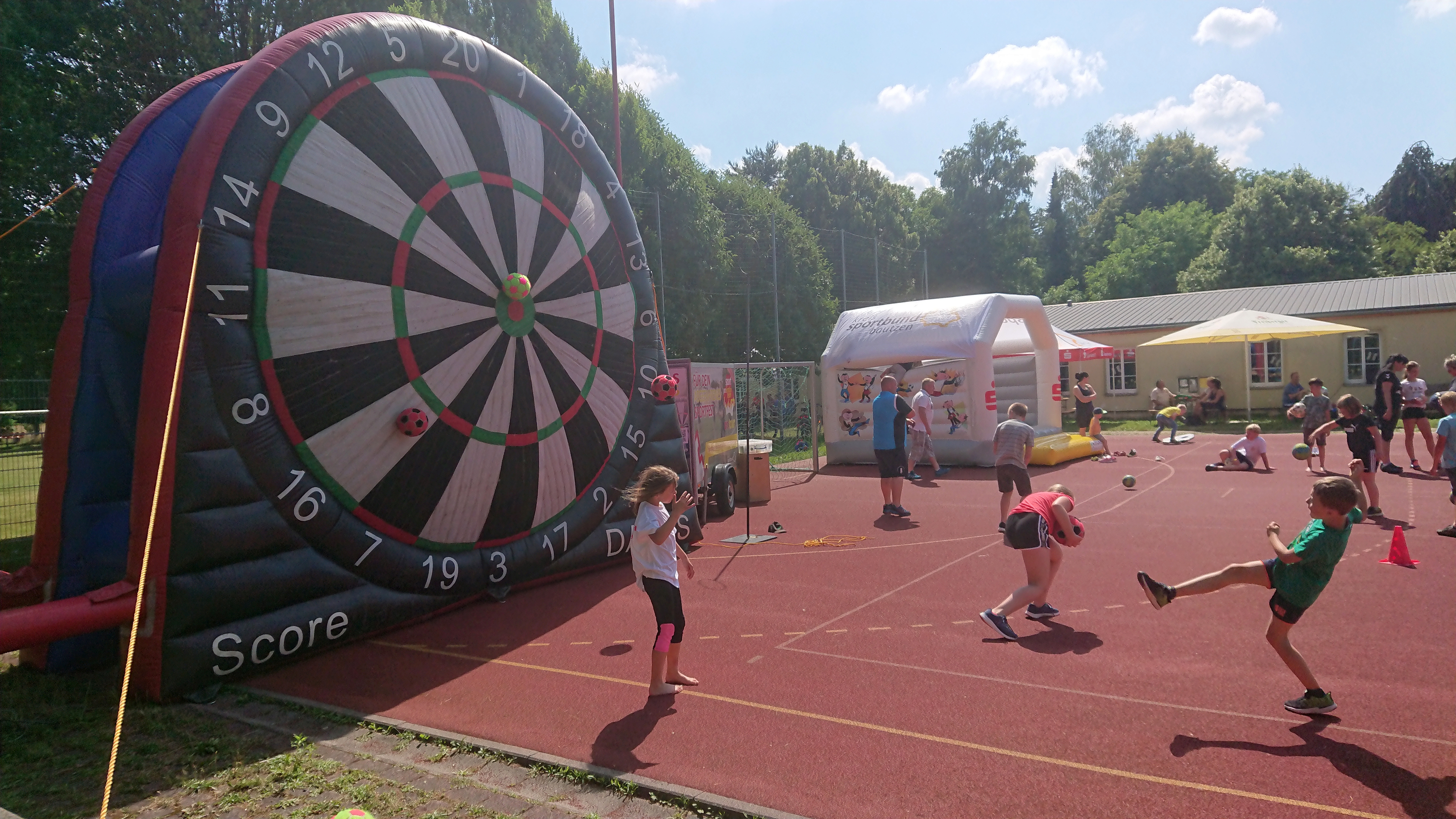 Dazu haben wir diesmal eine Vielzahl an Sport- und Spielgeräten aufgebaut, die für kurze Weile sorgen sollten. Als Höhepunkte für die Kleineren eine Hüpfburg und für die Größeren eine Fußballdartanlage. Aber auch eine Speedradarmessung für unsere Ballsportler war im Angebot.